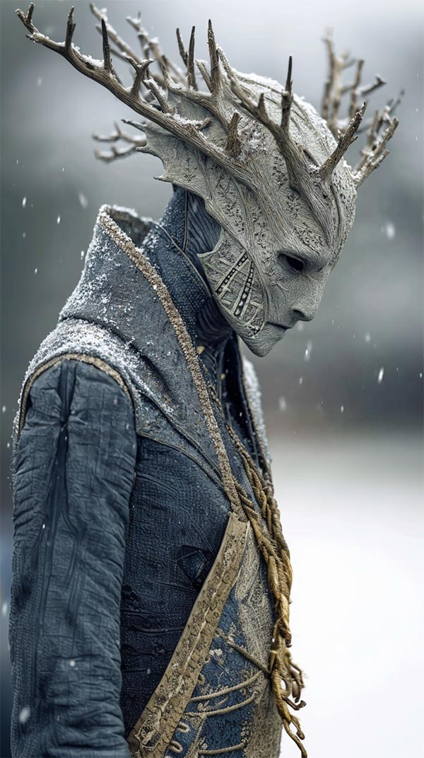 He stands beneath a sky the color of unfinished silver, snow resting along the branching antlers that crown his carved and weathered brow. Though he appears fashioned of bark and bone, something luminous pulses beneath the pale architecture of his skin. He was once the sentinel of a winter that refused to end—its stillness absolute, its hush unbroken. Yet now, as faint warmth travels through root and stone alike, he senses a change that does not threaten but promises.